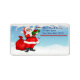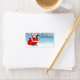 Le étiquette à thème Festive de Noël présente un Père Noël Jolly avec son sac rouge et ses cadeaux. Ciel bleu et arrière - plan couvert de neige. Customiser la zone de texte.
