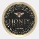 Le nom et l'emplacement de votre bibliothèque s'affichent dans une bordure incurvée le long de la partie supérieure du étiquette. Le mot HONEY est écrit dans une police métallique biseautée et le texte est reflété et fondu sous le mot. Le poids net du miel apparaît sous le étiquette en onces et en grammes. L'abeille stylisée.