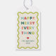 Créée pour aller avec la collection de cartes de vœux de vacances "Happy Merry Wavy", cette étiquette-cadeau de vacances ludique présente un cadre décoratif ondulé. Le message "Happy Merry Everything" est un salut non traditionnel qui peut s'appliquer à toutes les fêtes qui ont lieu pendant la période des fêtes. Les mots sont composés d'une variété de couleurs pour ajouter une touche de fantaisie au design. Juste en dessous du message se trouve un petit cœur et un espace pour le nom du client. Le dos de l'étiquette présente un motif ondulé coordonné.