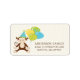Jolie étiquette de retour d'anniversaire avec un adorable singe portant un casquette de fête et tenant un tas de ballons.