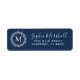 Étiquettes d'adresse de retour monogramme chic avec facile à personnaliser modèle - Une silhouette de couronne blanche entourant un monogramme élégant sur un arrière - plan bleu marine. Le modèle de votre nom est dans un élégant script de calligraphie et l'adresse est écrite dans une police simple. Des étiquettes d'adresse de retour personnalisées avec une couronne et un monogramme féminins ajoutent une touche propre et personnelle à votre courrier. Pour modifier la couleur arrière - plan, les styles et les tailles de police, cliquez sur le bouton Personnaliser.
