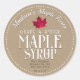 Votre nom d'entreprise est écrit dans une police de caractères élégante sur un arrière - plan kraft. Feuille d'érable à sucre rouge. MAPLE SYRUP est imprimé dans une police décorative avec une ombre portée. Bordure pointillée.