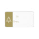 A holiday gift tag with a geometric gold and white pattern created with a simple picture font of a Christmas tree. The simple minimalist holiday gift have, "To" et "From" printed with room to write your names.