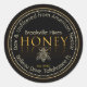 Étiquette noir avec le mot HONEY écrit et réfléchi en or métallique sur arrière - plan noir avec double or et pointillé bordure. Illustration vintage du contour des abeilles. Liste précalculée des conversions de poids net miel. Texte modifiable dans une bordure incurvée : "Raw & Unfiltered from American Nectar".