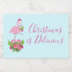 Conteneur étiquette avec un flamant de Noël à thème tropical portant un chapeau de santa rose. Sous ses pieds se trouve un bouquet de sucre de canne avec de jolies fleurs tropicales et des baies roses. Un bourgeon de saint sur sa poitrine.