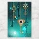 Or, clés antiques avec engrenages et cadrans accrochés sur chaînes dorées sur arrière - plan vert lumineux.
