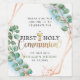 Végétation moderne aquarelle et cadre doré Première communion vin mousseux Étiquettes. Design avec feuilles vert aquarelle et cadre doré. Personnalisez avec le nom de votre enfant et la 1ère date de communion.