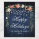 Elégante aquarelle Poinsettia Floral Happy Holidays Wine Bottle Étiquette comprend de belles poinsettias rouges aquarelle, verdure botanique, feuillage d'hiver, baies sèches, roses blanches, coton, cônes de pin et baies bleues. Bois bleu rustique et lumières à cordes.