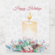 Arc rouge festif, bougie jaune aquarelle, baies sèches, brindilles et fleurs blanches sur des flocons de neige blancs arrière - plan