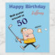 Ce étiquette de bouteille de vin personnalisé est un cadeau amusant pour un golfeur qui tourne les grands 50. Il présente votre texte personnalisé en rouge, bleu et noir stylisé. Actuellement, il dit "Toujours mettre' autour de 50". Un golfeur de bande dessinée prend un coup de pied à son ballon à côté du texte. Ajoutez votre message d'anniversaire et votre nom. L'image et le texte sont placés sur un arrière - plan bleu vif. *Cette conception utilise l'image © Graphics Factory.com*