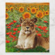 Une lionne majestueuse repose devant un champ de tournesols et de pavots, les fleurs du leo zodiac.