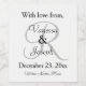 Elégant arrière - plan blanc croustillant avec texte noir réception de mariage favorise. Insérez le nom de famille monogrammé initial dans le centre en élégant script argenté. Avec le texte écrit en noir, With Love From, Groom and Bride's First Names, Mariage Date. Tapez dans Nom du vin ou supprimez le champ de la zone de texte. Conception par TamiraZDesigns.
