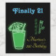 Une bouteille de vin à votre fête de 21ème anniversaire. Boisson parapluie vert néon avec texte vert qui dit Enfin 21 et texte d'anniversaire jaune avec votre nom. Une femme verte néon danse en fête.