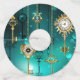 Or, clés antiques avec engrenages et cadrans accrochés sur chaînes dorées sur arrière - plan vert lumineux.