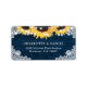 Rustic navy blue floral wedding address labels featuring sunflowers, string lights and delicate floral lace against a rustic wood background.