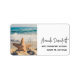 Étiquettes de adresse avec une photo pittoresque. Une grande étoile de mer dressée sur une plage de sable. Une belle mer bleue avec des vagues de surf blanc en arrière - plan.