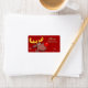 Rudolf, le personnage de rennes à nez rouge sur un arrière - plan enneigé rouge. Belle étiquette cadeau de Noël design autocollant.