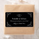 Vin mariage noir et blanc personnalisé ou étiquettes bouteille d'eau de source. Modèle autocollant à bouteille à eau élégante personnalisée avec coeurs imbriqués et bordure élégante avec tourbillons tourbillonnant. La typographie de script fantaisie pour les noms de mariée et mariée et message de remerciement. Utilisez comme décor de table classe ou merci pour les invités à la fête. Inclut le nom ou le monogramme plus la date du mariage. Design vintage romantique avec de beaux coins. A conseiller également aux mariages rétro. Créez vos propres étiquettes de bouteille d'eau minérale naturelle avec ce modèle do-it-yourself classe. Couleur arrière - plan personnalisable.