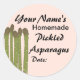 Utilisez ces autocollants pour le dessus de vos couvercles de bocal de conserves sur vos cornichons faits maison et appréciez. Le modèle a une image de quelques asperges lances sur un arrière - plan de pêche léger. Vous pouvez modifier la couleur de l'arrière - plan si vous le souhaitez. Les autocollants de conserves disent, "Votre nom est des Asperges cuites maison." Ajoutez votre nom au modèle pour personnaliser. Vous pouvez modifier ou supprimer n'importe quel mot du modèle. Il y a également de la place pour que vous écriviez dans la date plus tard. Mettez quelques-uns de ces gâteaux faits maison sur vos couvercles de jarre et vos proches seront aussi impressionnés par la présentation qu'ils seront avec vos délicieuses gâteries.