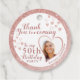 Créez des étiquettes roses personnalisées en or et en Merci blanc pour la fête du 50e anniversaire avec un design élégant qui comprend une photo en forme de coeur, nom, et le cinquantième jalon. Utilisez le modèle pour taper votre texte et télécharger une image. Vous pouvez également changer le jalon en 30ème, 40ème, 60ème et ainsi de suite. Cette conception est faite avec les coeurs et la typographie en or rose.
