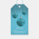 Festive numériquement créé une collection de baubles bleus de Noël accrochés à une corde d'argent. L'arrière - plan est un joli dégradé bleu avec quelques flocons de neige. Il y a aussi une zone de texte personnalisable qui se lit maintenant "Joyeux Noël !". De l'autre côté, il y a un endroit pour écrire les noms du destinataire et du donneur de cadeaux.