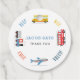 Transport thème fête d'anniversaire avec une étiquette d'un camion bleu, train, autobus scolaire et un avion.
