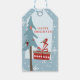 Marque cadeau de saison tendance moderne en bleu et blanc poussiéreux avec des flocons de neige en chute et un pin mignon avec des ornements, une grande boîte cadeau, et un petit cardinal rouge.++++++++++ Personnalisez-le avec votre texte et votre signature !