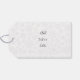 L'étiquette cadeau de Noël comporte des branches de pins verts et des ornements avec Joyeux Noël dans la couleur verte correspondante. Motif de flocon gris clair et blanc dans l'arrière - plan des deux côtés. Texte personnalisable dans une jolie police d'écriture noire sur le dos.