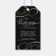 "Welcome Script Calligraphy Black and Gold Scrolls Favor Gift Tags." Elégant défilement de parties scintillant dorée motifs jumelés avec la police calligraphique ornée de lettres et votre message d'amour pour vos invités. L'envers a une conception de travail de défilement partout avec vos initiales monogrammes. Art dessiné sous forme graphique par Audrey Jeanne Roberts, artiste titulaire d'une licence internationale, copyright.
