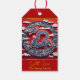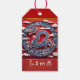 Dragon chinois inspiré par une image traditionnelle coupée en papier avec des nuages blancs devant un arrière - plan décoré (modèle n°3). Happy New Year est en Idéogrammes chinois blancs + voeux anglais "Happy New Year". Conception sur étiquette cadeau avec message pour personnaliser à l'arrière. Carte de voeux, carte postale, invitation, autocollant, fournitures artisanales et plus encore... Parfait pour le Nouvel An Chinois Dragon 2024.