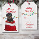 Sur le devant de cette étiquette cadeau de Noël est l'image d'un mignon chiot Rottweiler dans un sac cadeau de Noël rouge et blanc. Derrière le chien se trouve une série de lumières colorées de Noël. Le texte en haut dit "Joyeux Noël". Le dos de la balise répète l'image des lumières de Fêtes, avec des champs de texte en rouge pour vous permettre de customiser.