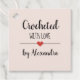 Une étiquette moderne "Crochetée avec amour" avec une police noire sur un arrière - plan rose vif agrémenté d'un coeur rouge mignon. Customiser du texte.