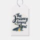 L'image comporte une phrase de motivation "Le voyage commence maintenant" écrite en grandes lettres stylisées et bleu foncé. Le texte est entouré de petites étoiles jaunes éparpillées un peu partout, donnant un sentiment d'émerveillement et d'excitation. Sous le texte, il y a une route sinueuse qui part du bas de l'image et mène vers l'horizon. Au début de la route, il y a une petite casquette de graduation, symbolisant le début d'un nouveau voyage, probablement après l'obtention du diplôme. La route est dépeinte dans les tons bleu et jaune, ajoutant une sensation dynamique et pleine d'espoir à l'image.