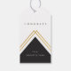 Un tag cadeau moderne avec message de félicitations personnalisable avec des éléments triangulaires noirs et or.