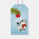 Une étiquette-cadeau drôle et mignonne avec un thème de noël. Un chat minable et espiègle. Elle regarde une décoration d'arbre de noël accrochée à une branche de pin en se demandant si elle devrait jouer avec ou non. Texte dit Joyeux Noël dans une police fantaisiste. Placez-vous sur un arrière - plan bleu avec des flocons de neige blancs. Le dos indique "De" et "À :" pour que vous puissiez personnaliser.