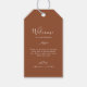 Ces étiquettes cadeau de bienvenue mariage en terre cuite minimale sont parfaites pour un mariage boho. Le design se compose d'une simple silhouette de feuille de verdure orangée brûlée et minimaliste de style bohème désert. Personnalisez les étiquettes avec l'emplacement de votre mariage, une brève note de bienvenue, vos noms et la date du mariage. Ces étiquettes sont parfaites pour les mariages de destination et les sacs de bienvenue des clients de l'hôtel.