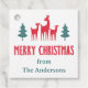 To from gift labels featuring a group of deer flanked by two green Christmas trees and the text “Merry Christmas”. Customizable text below in green on a white background. Customizable text “to” and two lines for writing on the back.