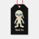 Balises cadeau Merci avec une image Halloween cool. Une momie enveloppée dans ses bandages. Joyeux visage souriant. Une adorable créature éffrayante.