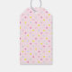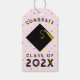 Étiquette de cadeau de diplômé rose pour fête de fin d'études avec un capuchon noir et un pompon doré sur fond à pois. Modifiez le texte pour personnaliser.