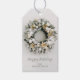De magnifiques étiquettes-cadeaux comportent une belle couronne de pin enneigée ornée de fleurs et d'ornements d'arbres de Noël blancs et dorés avec un accueil et votre nom ou nom d'entreprise. CORRESPONDANCE d'objets dans notre collection.