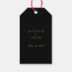 Customisez ces Elégantes Tags Cadeaux Merci, conçus avec un design moderne script à la main audacieux faux parties scintillant en or Merci de texte! sur un arrière - plan noir. Veuillez noter que l'or est une empreinte couleur (jaune) et n'est pas en fait de couleur or métallique ou de feuille or ou de parties scintillant. N'oubliez pas de remplacer les informations de modèle à l'arrière par les vôtres.