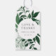 Attachez ces étiquettes botaniques élégantes à vos faveurs de mariage pour dire merci à vos invités avec style. Les étiquettes blanches présentent une bordure ronde de feuillage hivernal dans des nuances fraîches de vert chasseur, encadrant "amour et remerciements" ainsi que vos noms et date de mariage en lettrage classique. Tout le texte est modifiable pour une personnalisation ultime. Conçu pour correspondre à notre collection de mariage Wild Forest.