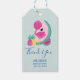 Une marque cadeau de remerciement de fête avec une jolie illustration d'un flamant rose avec quelques pastèques et ananas. Couleurs rose et vert. L'été et tropical. L'arrière - plan est de couleur vert pâle avec des pois blancs.