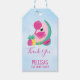 Une marque cadeau de remerciement de fête avec une jolie illustration d'un flamant rose avec quelques pastèques et ananas. Couleurs rose et vert. L'été et tropical. L'arrière - plan est bleu clair.