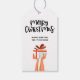 Whimsy Joyeux script de Noël et mains illustrées rétro et cadeau emballé, étiquettes cadeaux de vacances. Fonctionnalité des étiquettes, deux lignes pour votre texte et la coordination de l'arrière-plan de couleur rouge rétro.
