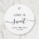 Chic mariage favoritisme étiquettes avec "l'amour est doux" en lettres simples et un script élégant avec des swashes, vos prénoms unis par un coeur et votre date mariage.