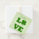 Ensemble de 12 étiquettes de faveur carrés avec une image de la phrase "Lucky in Love" en écriture verte et de grandes lettres de blocs verts, et un trèfle vert quatre feuilles sur un arrière - plan de vignes et coeurs fantaisistes sur vert clair. Le dos a l'image de vignes et de coeurs fantaisistes sur le vert clair et texte personnalisable. Consultez la collection de draps de la Saint-Patrick pour la fête des faveurs et des cadeaux dans la section FAVORISATIONS DU PARTI.