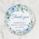 Design élégant pour étiquettes de remerciement avec fleurs de bleu poussiéreux aquarelle, eucalyptus frais vert mélangé et tissé dans un cadre doré faux. Lettres manuscrites dessinées à la main de style moderne.