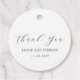 Balises de mariage de style classique avec un design simple mais élégant avec "merci" dans une calligraphie élégante avec vos noms et votre date. Le dos a votre trois monogramme initial. Utilisez le modèle pour ajouter votre message personnalisé.