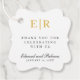 Elégante étiquette de faveur de mariage avec un design simple avec le message, "Merci pour célébrer avec nous". Ci-dessus se trouve votre deux monogramme initial en faux or et ci-dessous sont vos noms en calligraphie et date dans une police serif, sur un arrière - plan blanc. Ces étiquettes chic et élégantes ajoutent une touche de classe à vos préférences.